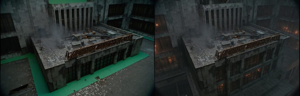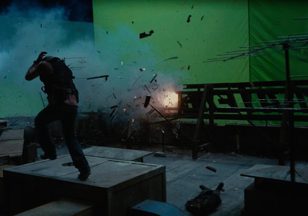 Other times I’d have a more technical problem-solving shot, like this green screen nightmare from A Good Day to Die Hard.  The plate didn’t have a continuous green screen. You can’t even see the plywood in the ‘before’ image, but trust me, it’s there to the right.   Composition was many, many layers thick as I pieced sections together and also rendered the helicopter as another element.  I had to use all the tricks I know and a massive amount of patience.  These layers, combined with layers of smoke and other elements, made the final work well.